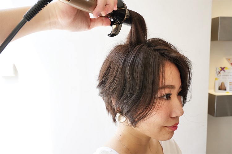 頭皮に対して90度以上の角度をつけながら毛束を取るのが、アップステム。アップステムの状態で巻くことにより、髪の根元にボリュームが出ます。