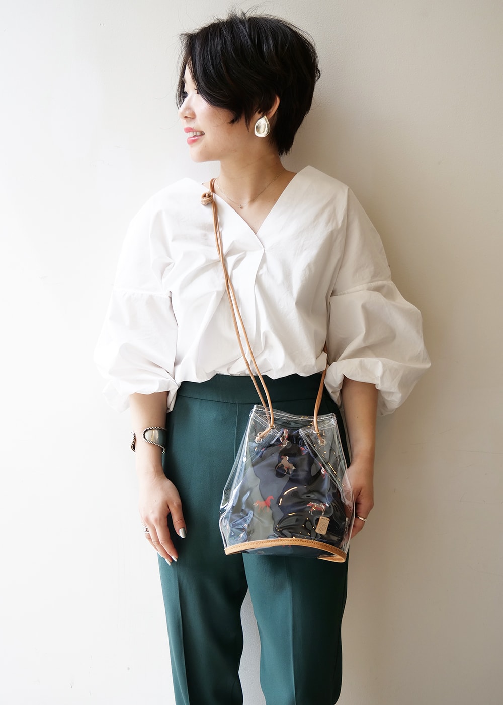 爽やかな印象を演出してくれるバケツ型ショルダーバッグ。ビニール素材を採用し、トレンドを意識したデザインがポイント。カジュアルにもキレイめにも、コーディネートに合わせやすいのも◎