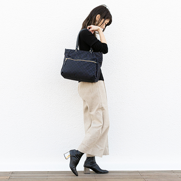 タックを入れ、バランスが取れたフォルムが特長のトートバッグ。普段使いしやすいサイズ感で、何より軽量な仕上がりになっているのもポイント。持ち手には、厚みがあり持ちやすいよう調整した部材を使用。またファスナー部分には、スムーズに開閉できるよう、レザー引手を施すなど、より使いやすいデザインに仕上げました。