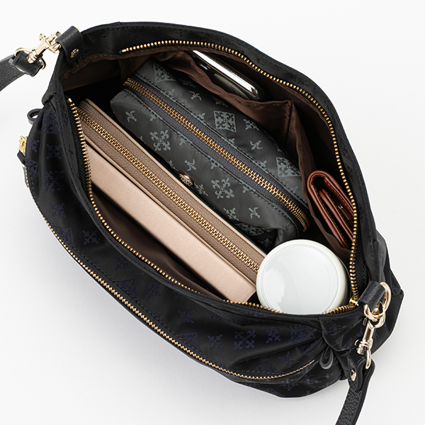 身体に馴染みやすいフォルムと、使い勝手の良いサイズ感に仕上げているのもポイント。ファスナー仕様で、防犯面でも安心。見た目以上の収納が可能な上、内装ポケットも充実しているので、細かいアイテムの仕分けも可能。