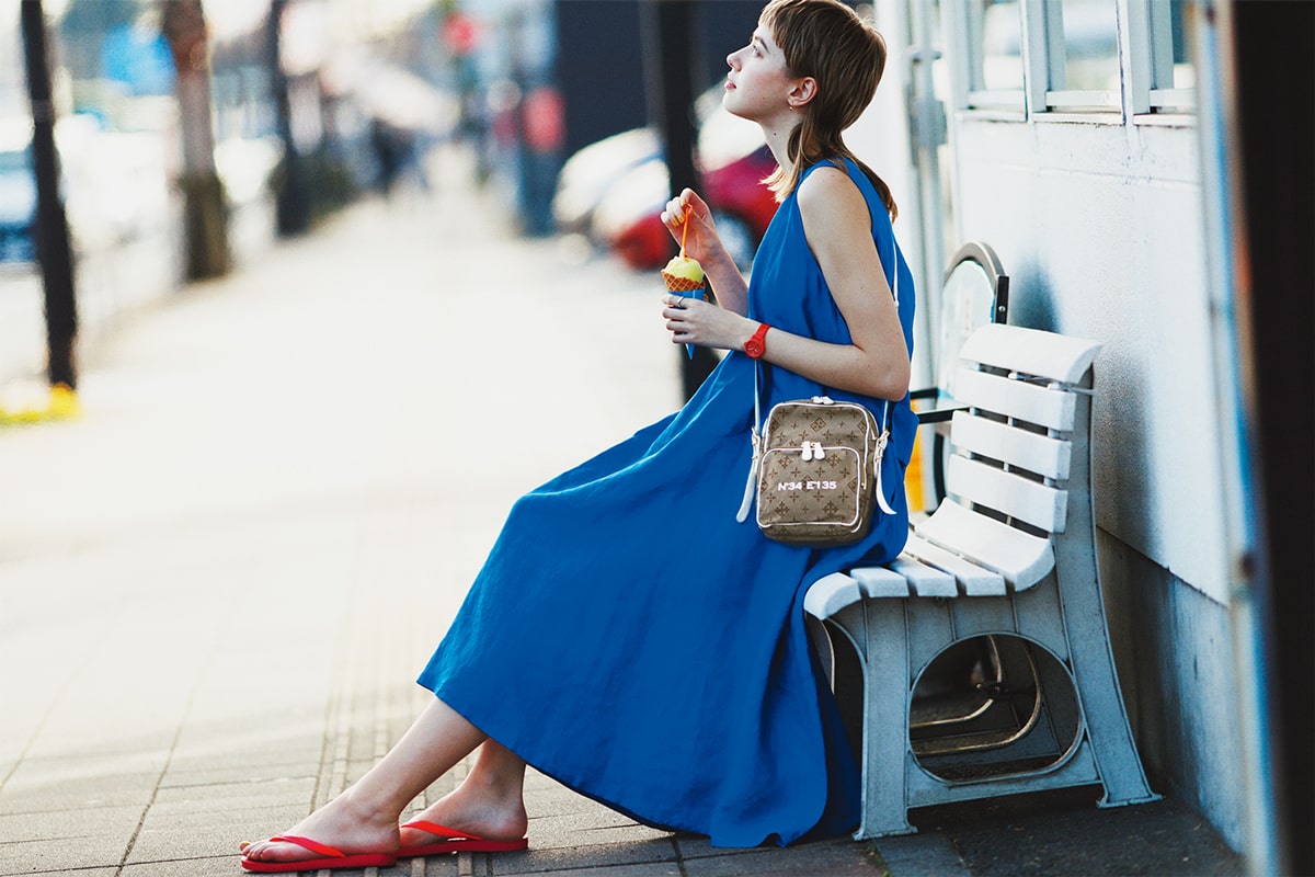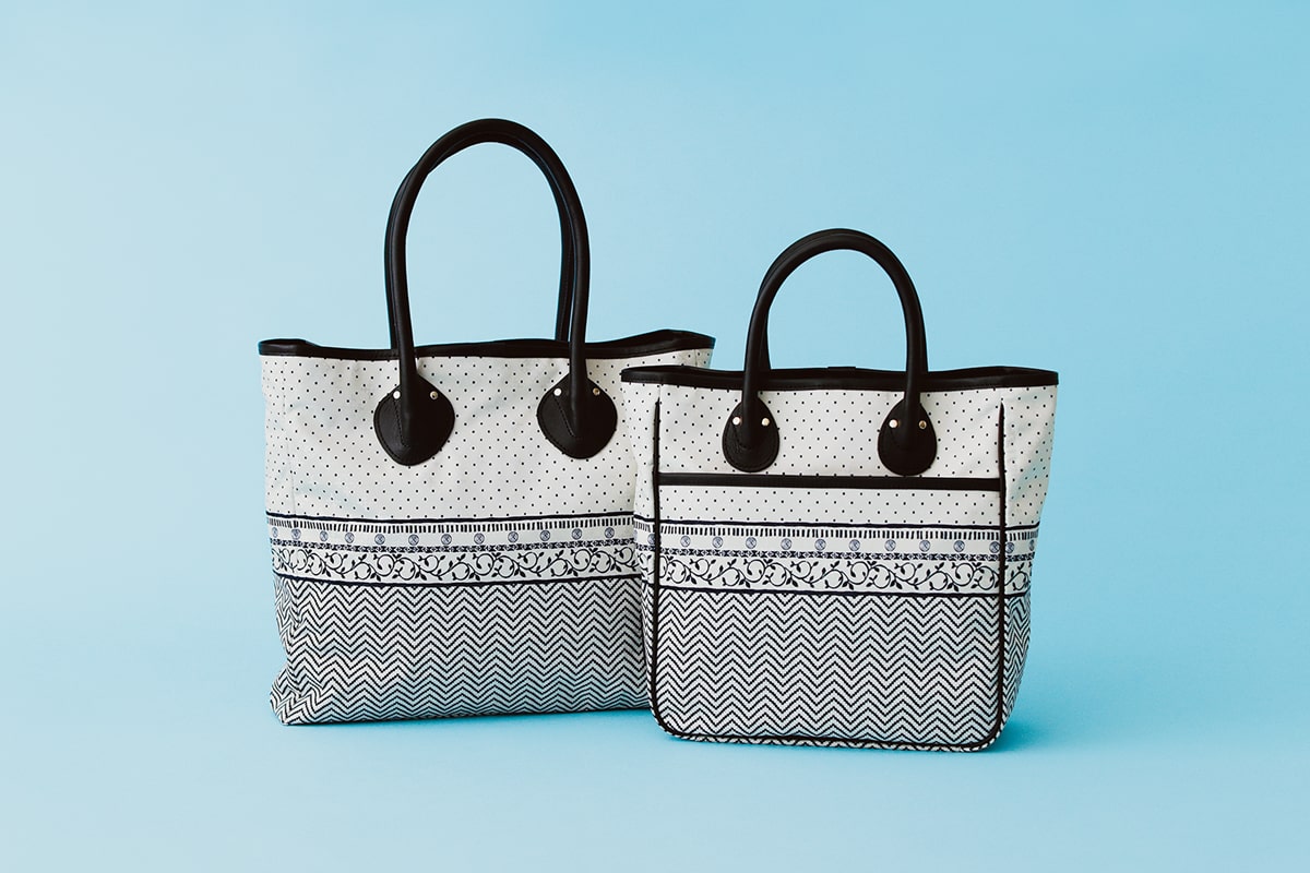 暑い異国の地の、伝統的なろうけつ染めからインスピレーションを得たオリジナルプリント。モノグラムを織り込んだナイロンジャカード生地にプリントを施しているため、光の当たり方によってモノグラムが見え隠れするのも特徴的。裏地にはきれいなブルーカラーを使用し、爽やかな印象をプラス。