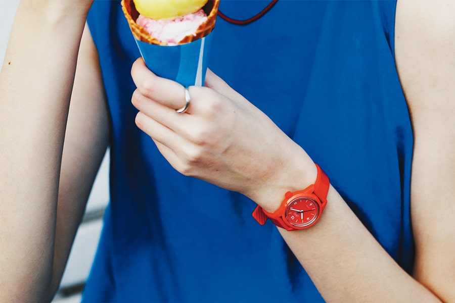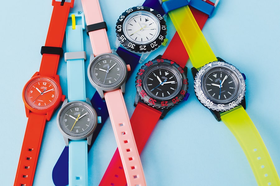 電池切れや水濡れを気にせず使え、着ける人をよりアクティブにさせてくれる腕時計。ポップな色がアクセントになり、スポーツやレジャーシーンでの着こなしをアップデート。思い切りラフ(=Raugh)に、思い切り笑う(=Laugh)ことのできる充実した日々をお届けします。「ミニ」と「ダイバー」の2型があり、それぞれ写真の他にホワイト・ブラックを加えた全5色を展開。