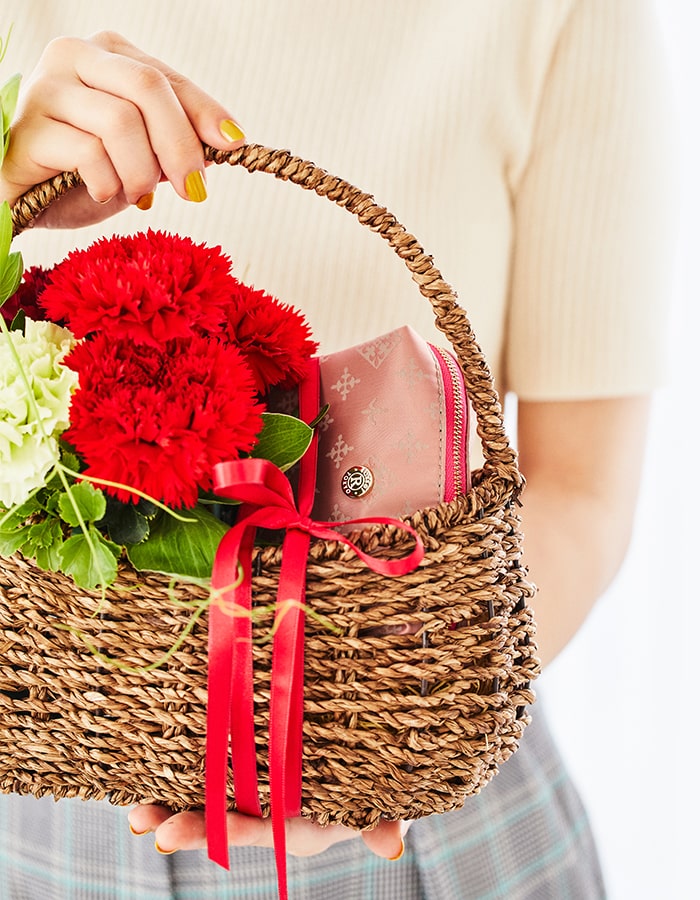 バスケットには、このギフトセットだけの限定デザインのポーチをセット。使いやすいサイズ感で人気のAsh Pinkで仕上げたスクエアデザインです。