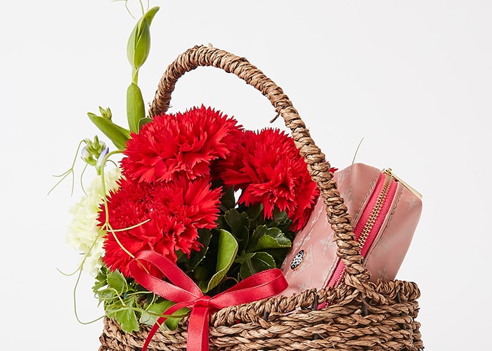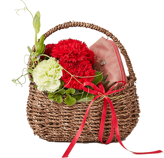 青山フラワーマーケットANNEXさんによる華やかな赤いカーネーションのアレンジメント。バスケットとリボンでデコレーションしてお届けします。