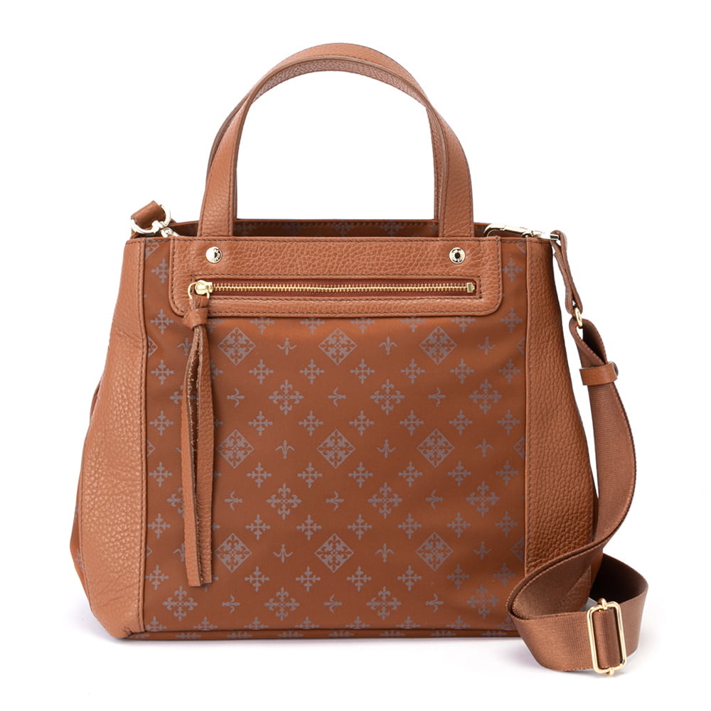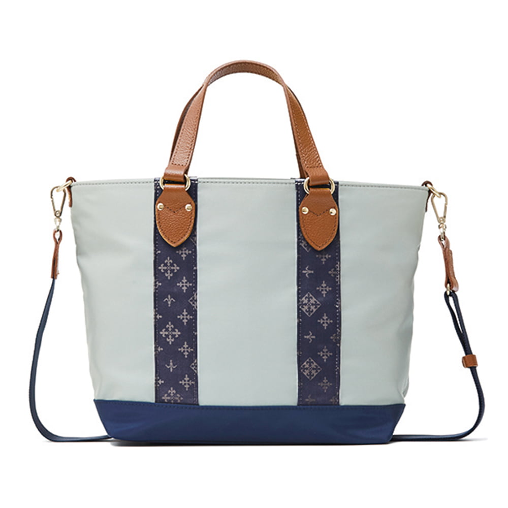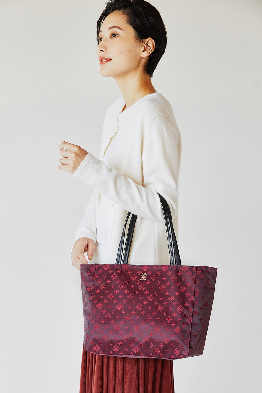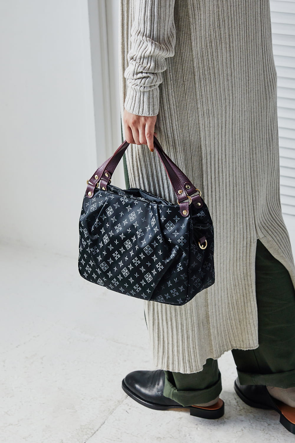 上品な艶感のある無地ナイロンとラシットのモノグラムジャカードを組み合わせ、さらにレザーでアクセントをプラスしたミニトート。