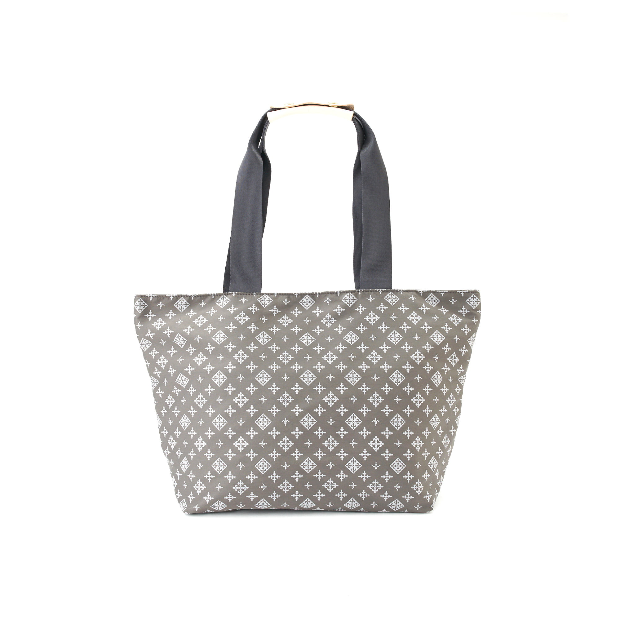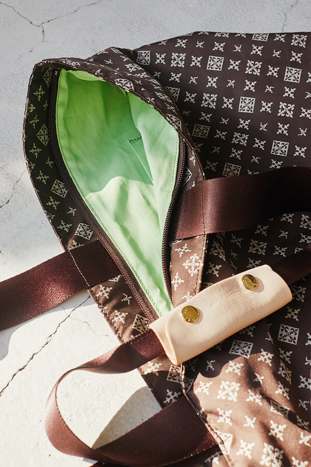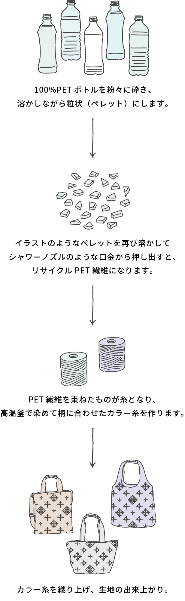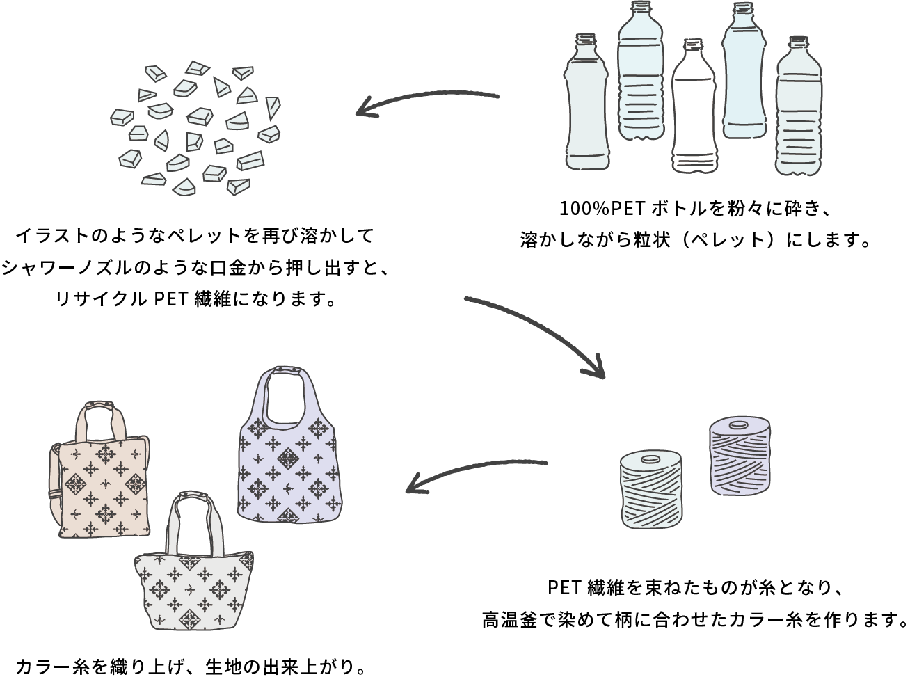 サスティナブルバッグの素材には、100%PETボトルからリサイクルした糸で織った生地を使用。ラシットオリジナルの柄は、タテ糸とヨコ糸を交差させて表現しています。高密度で織られているので、モノグラム柄の細部まで美しく表現できることが特長。独自の技術で耐久性も強化しています。