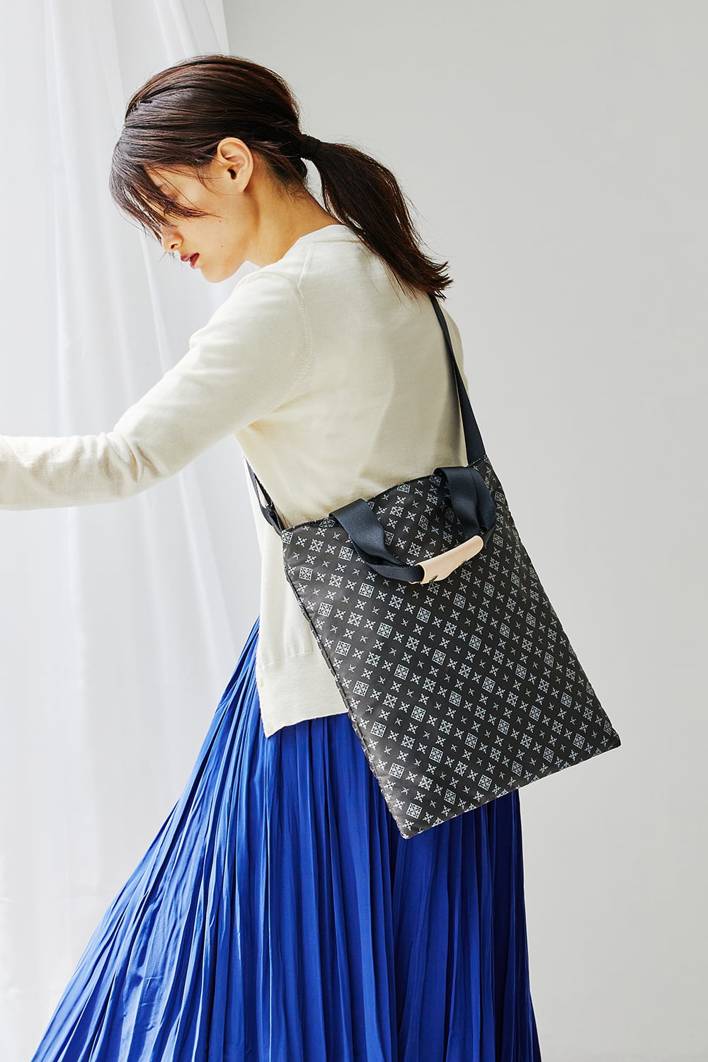 同プロジェクトで作成したバッグは、全4型。開発から携わった生地には、100%ペットボトルをリサイクルして作られる再生ポリエステルを使用しています。カラーは、どんなコーディネートにも馴染みの良いカーボンブラック、ダークブラウン、ネイビーの3色。ハンドル部分に用いたヌメ革が、ほど良い上質感を演出してくれます。