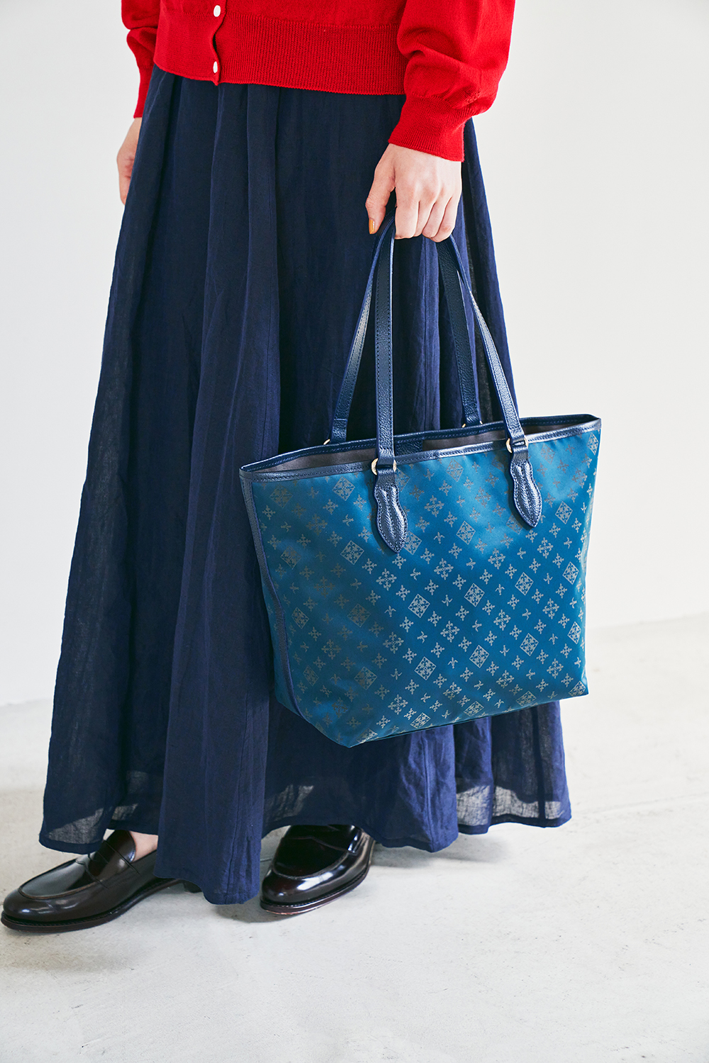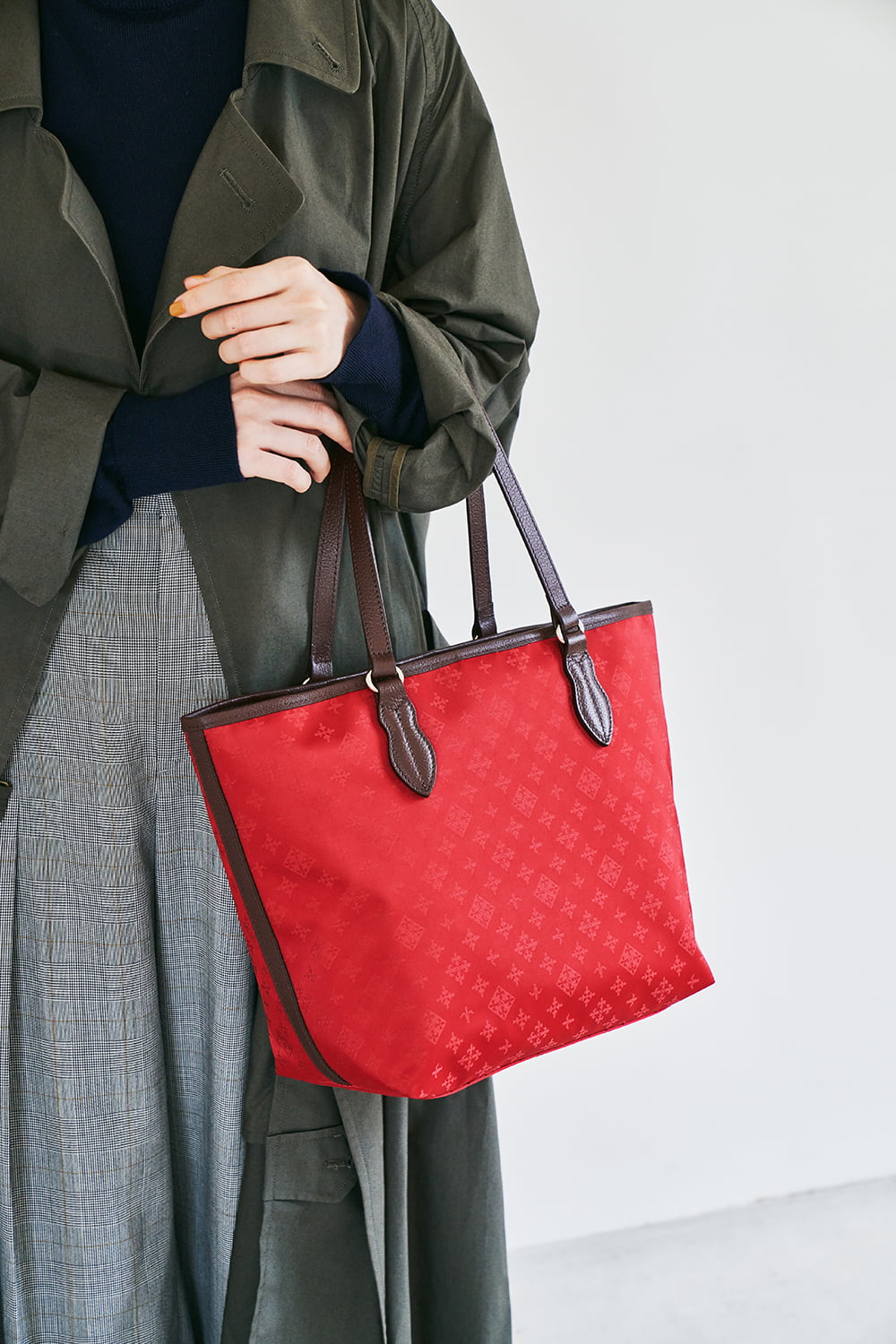 持つだけで心まで華やぐようなレッド。ブラウンレザーと組み合わせることで、より大人っぽく持てるトラッドな印象に仕上げました。