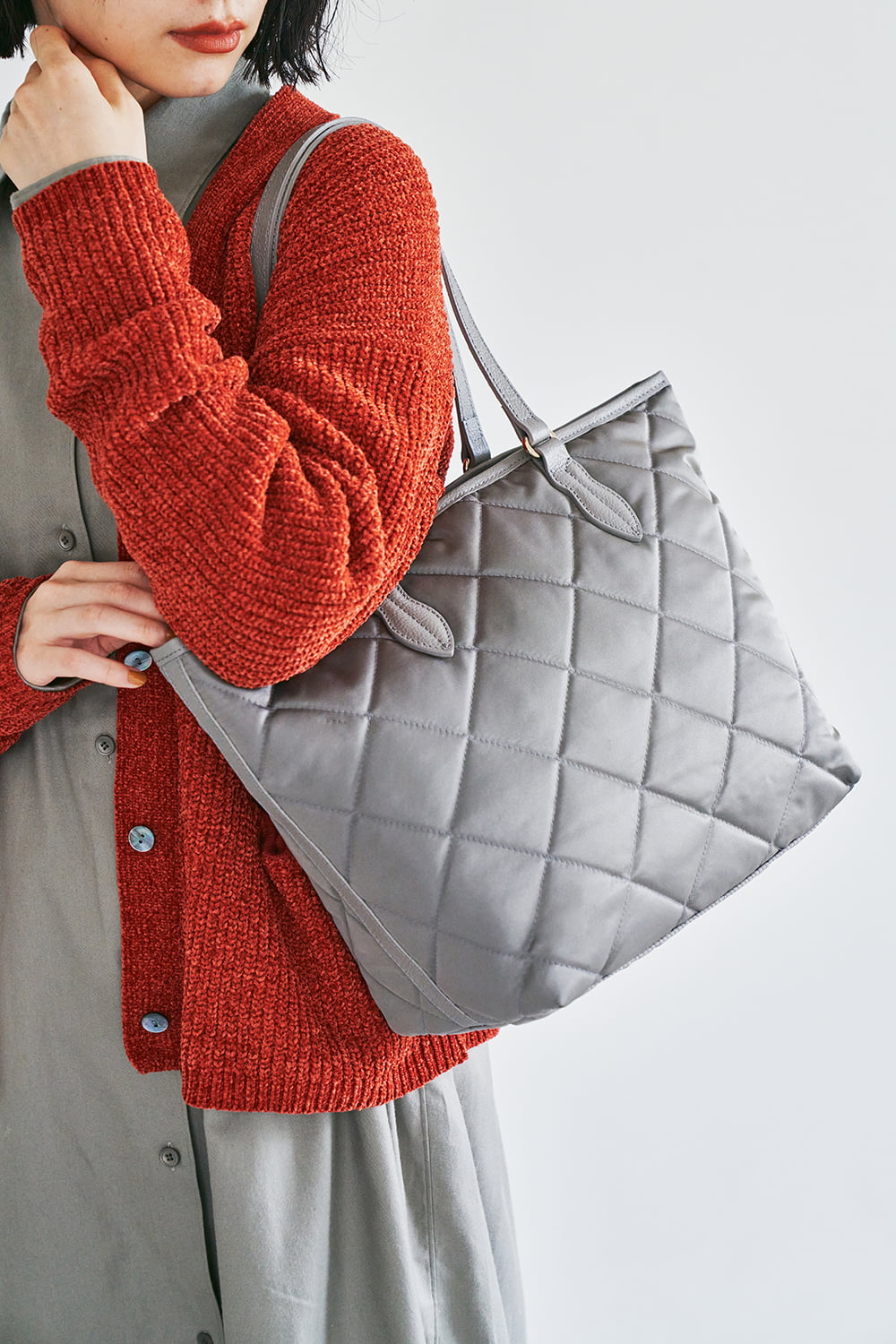 ニュアンス豊かなグレーのキルティングナイロン。季節問わず、どんな装いにも必ずマッチしてくれる頼れる1色。上品な光沢感できちんとした印象も。