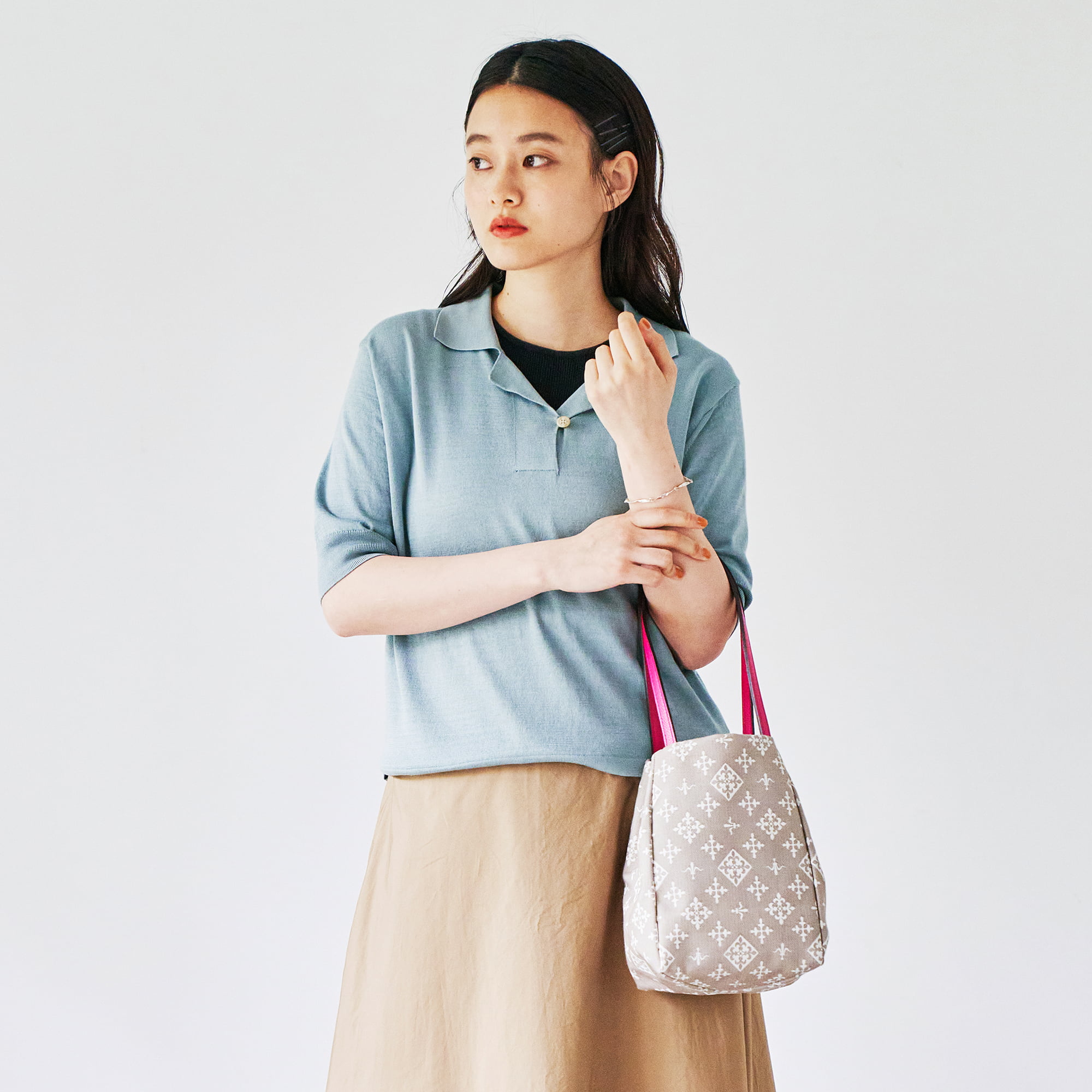 バッグをプラスするだけでスタイリングがぐっと印象的に。