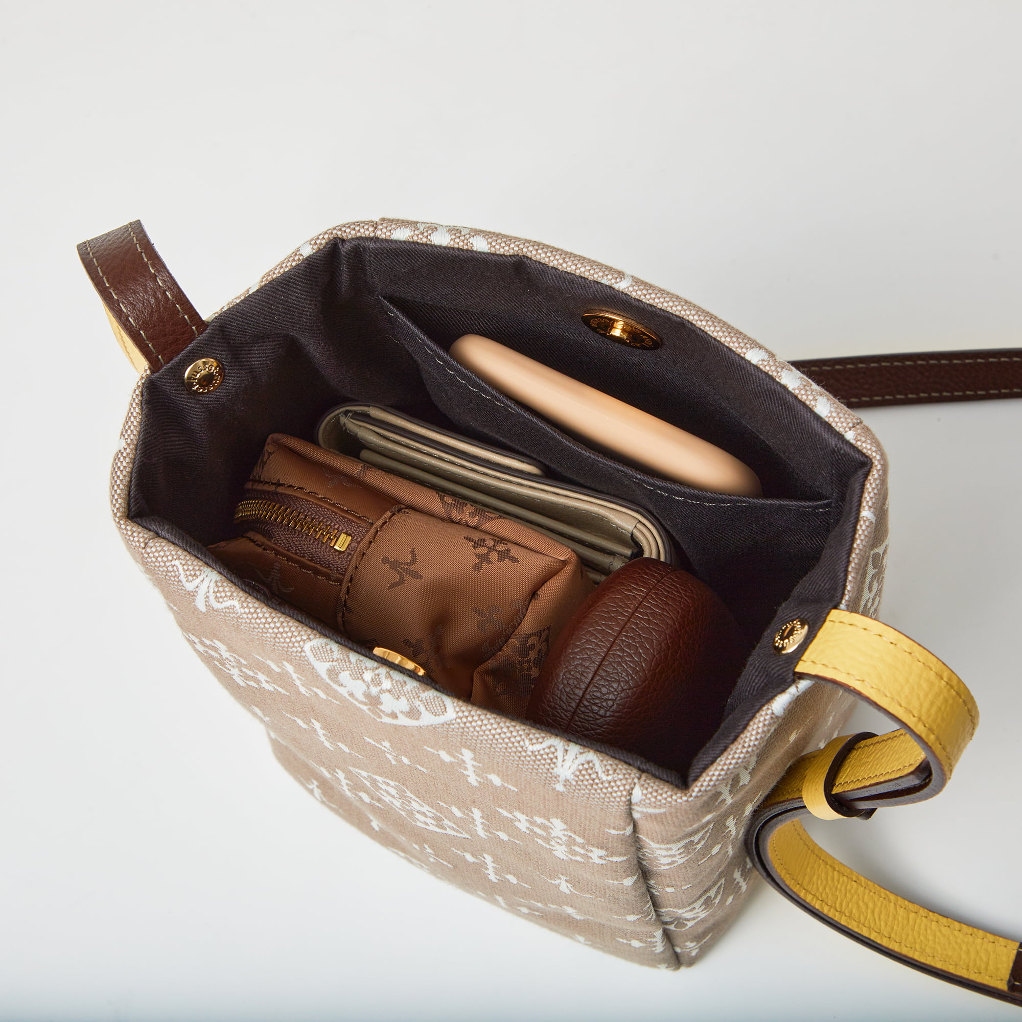 クロスボディスタイルを柔らかなイエローカラーで新鮮な印象にまとめて。