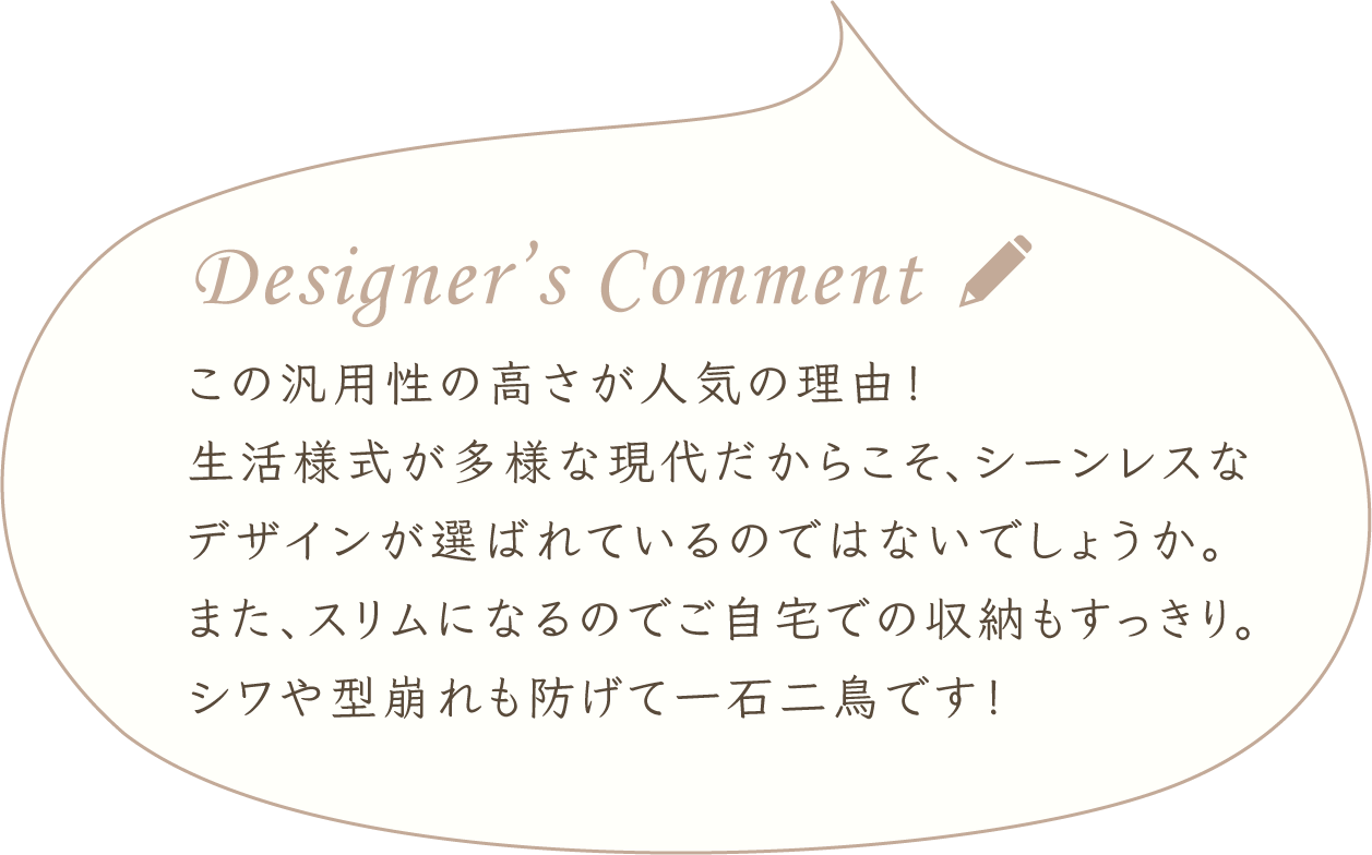 無駄をそぎ落としたミニマルな設計だから、カジュアルになりすぎずすっきりとまとまります。