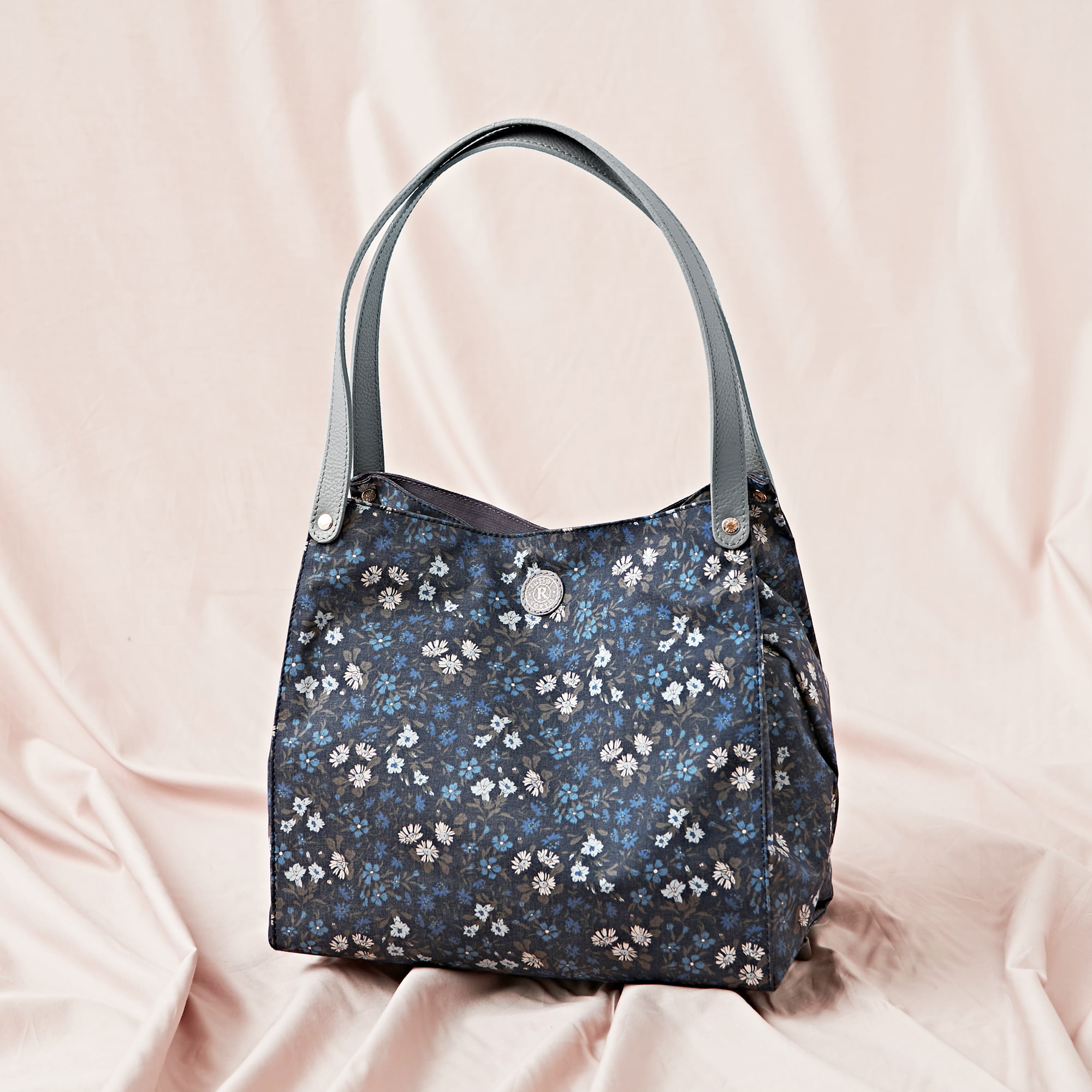シックなネイビーベースに、ホワイトやブルーの花柄で爽やかな印象に。