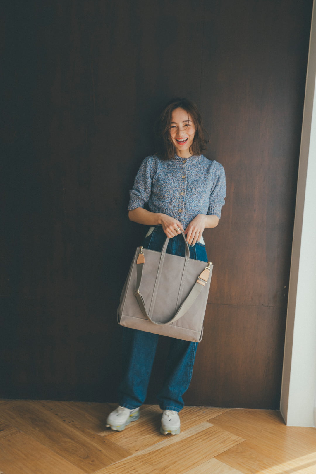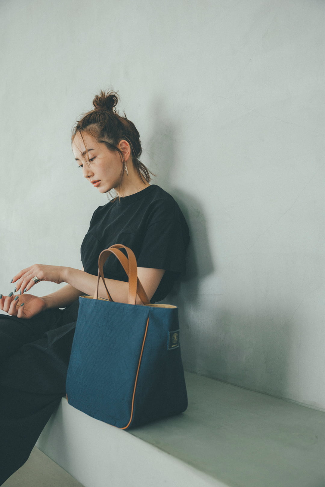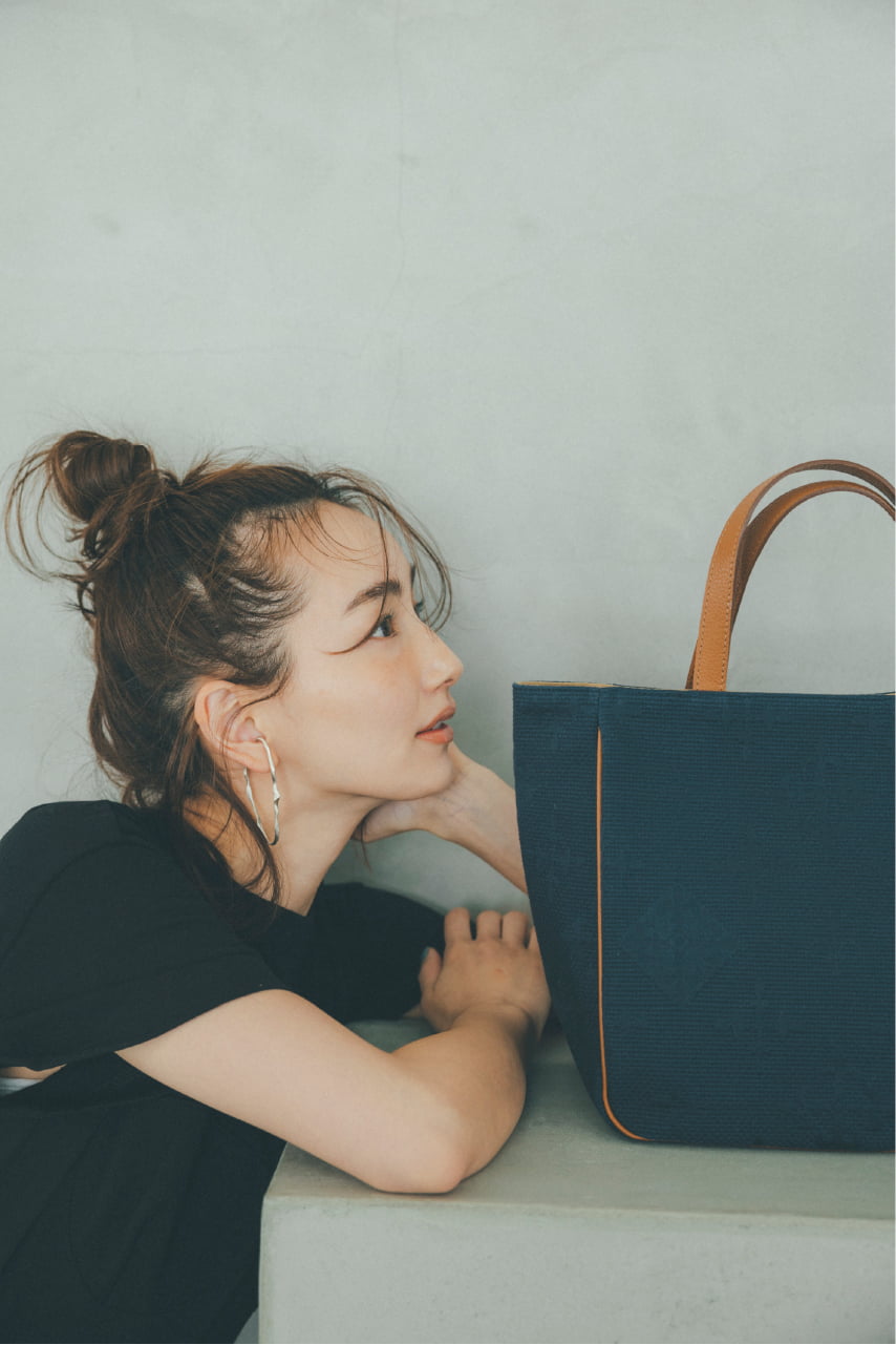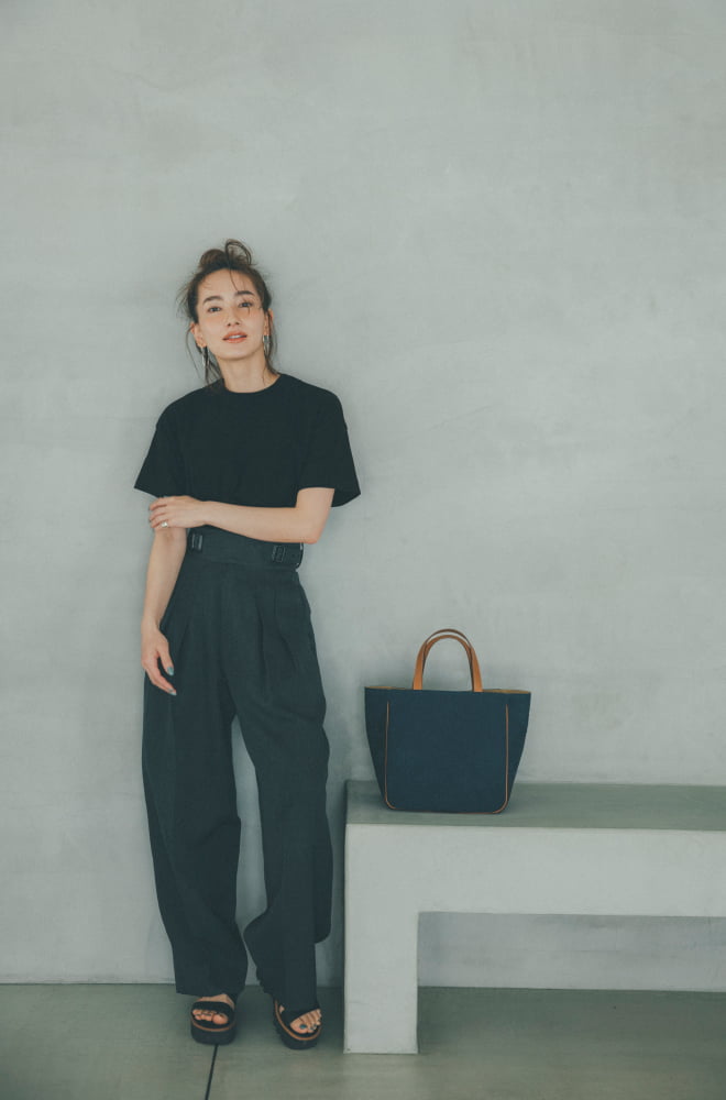 織り模様のネイビーバッグを主役に マニッシュなパンツスタイルを堪能
