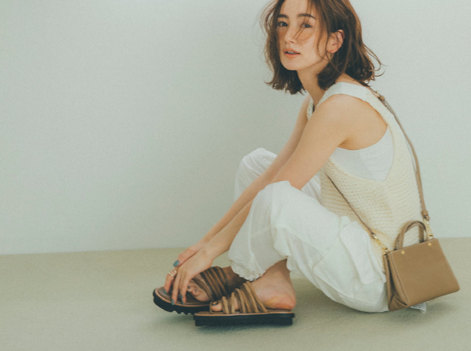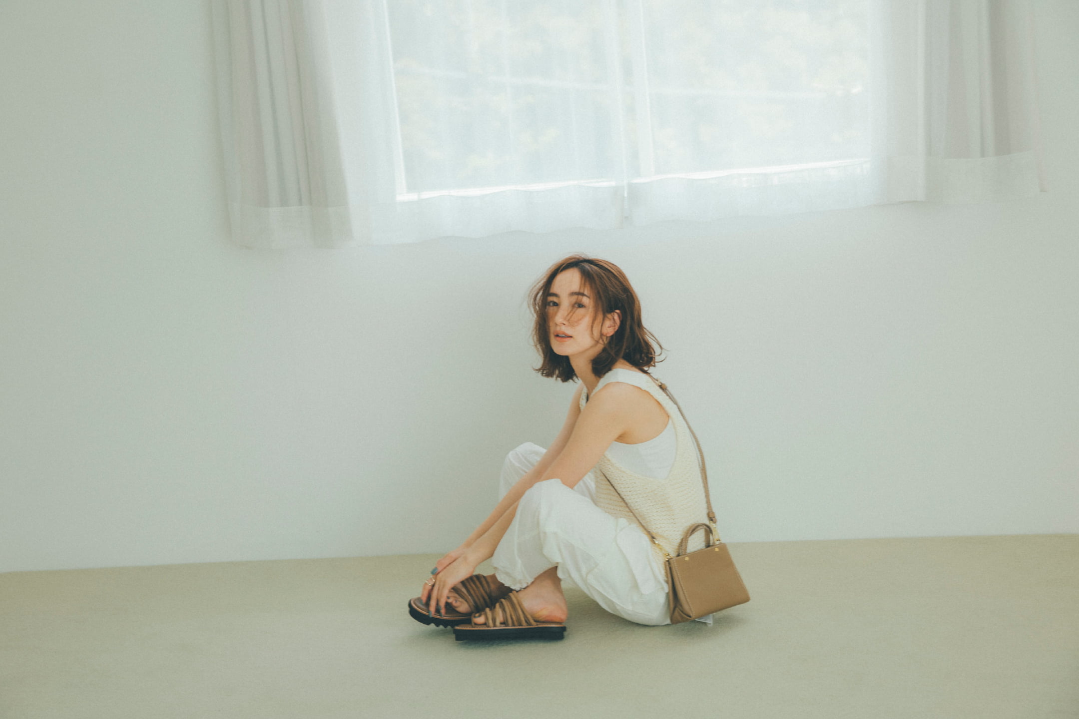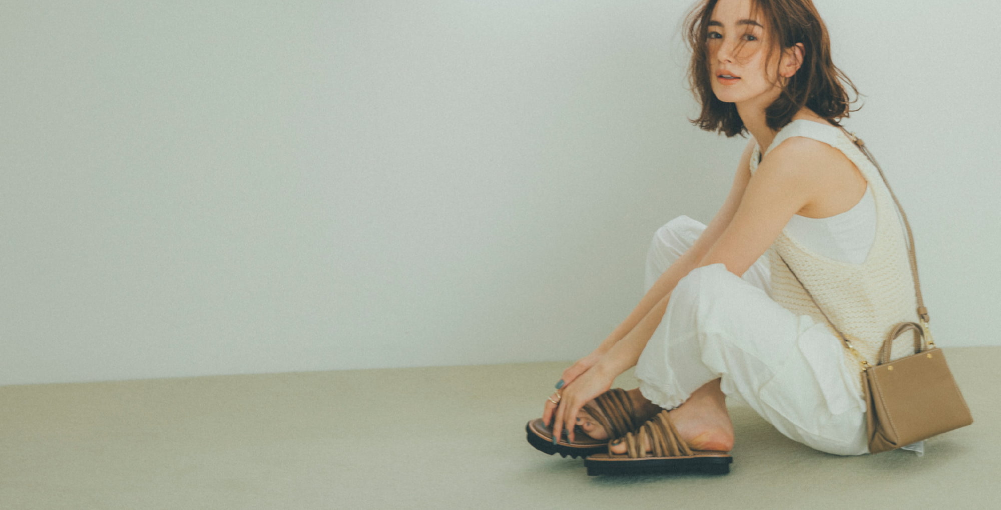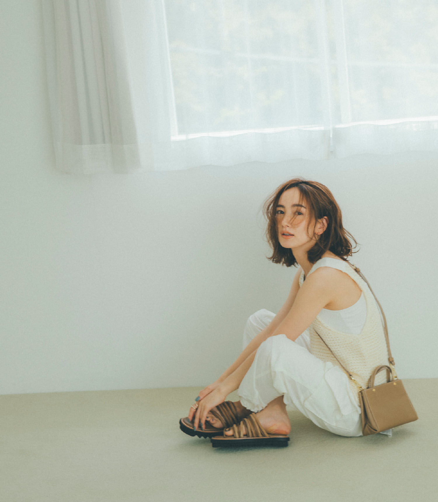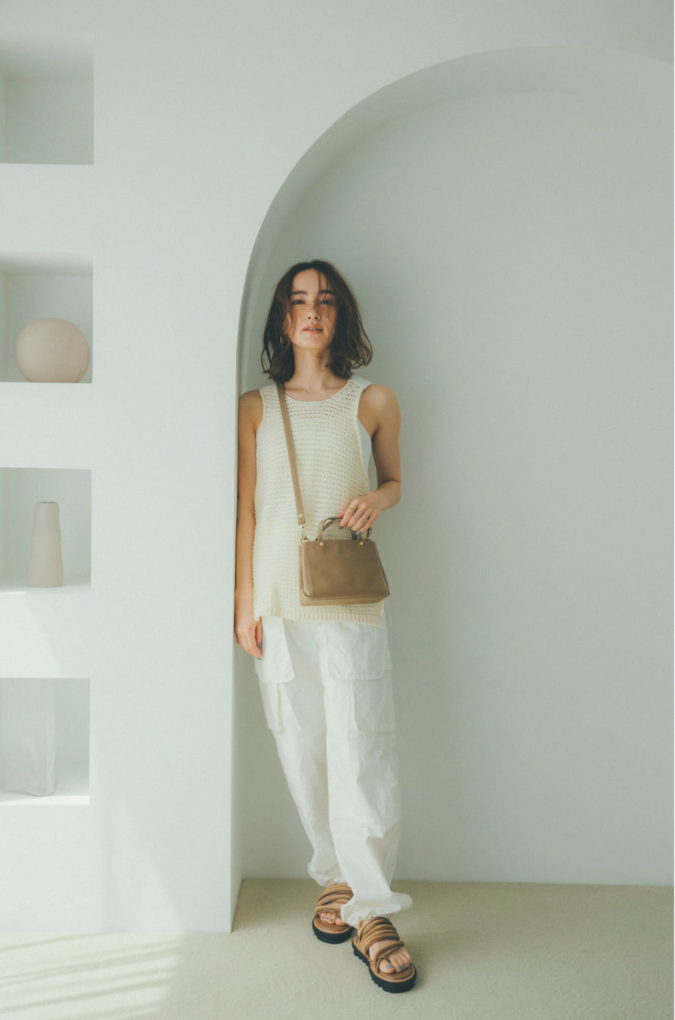 夏らしい白のワントーンに 小さなバッグを馴染ませて