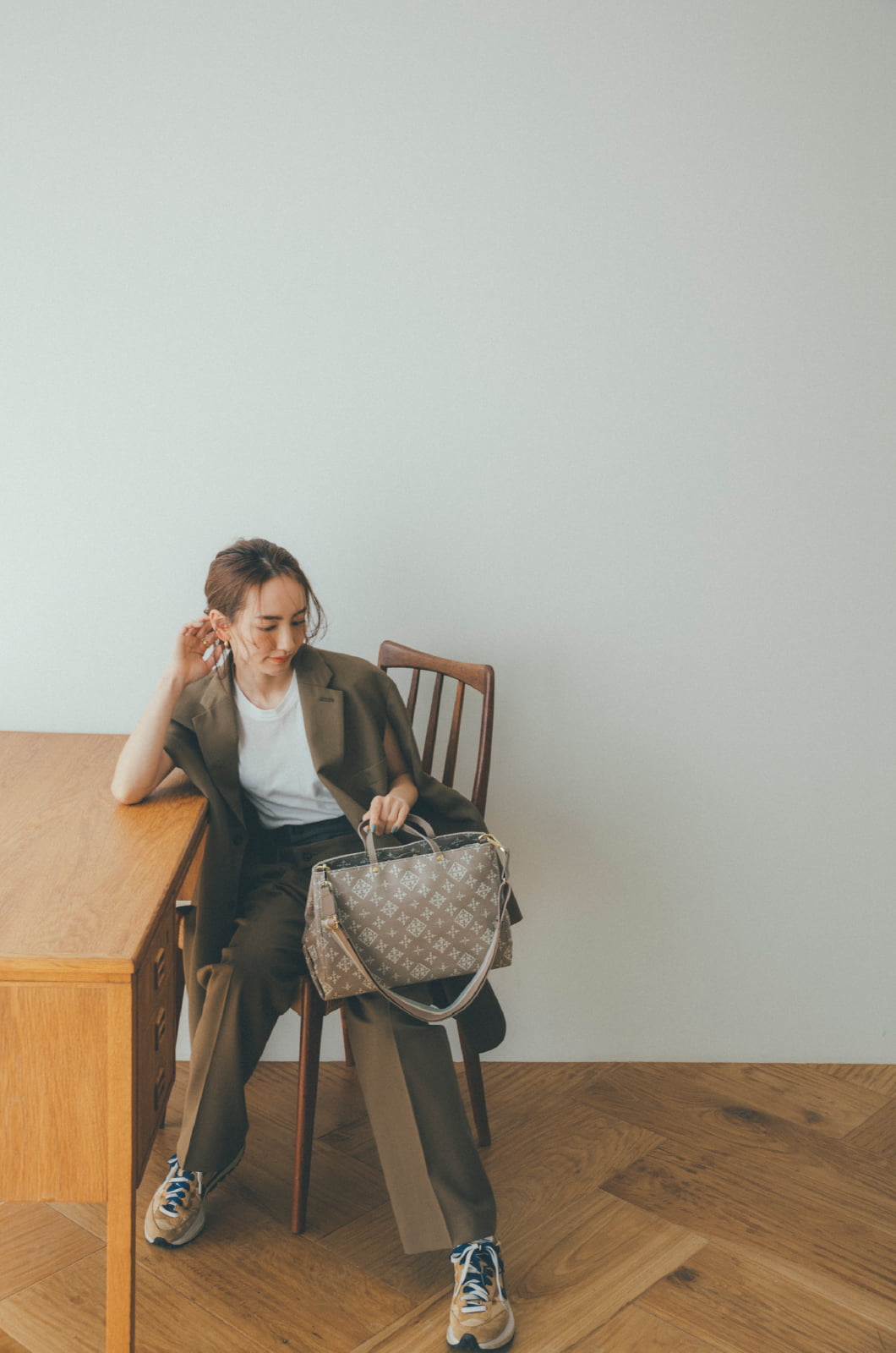 シンプルなスーツスタイルに モノグラムを効かせて