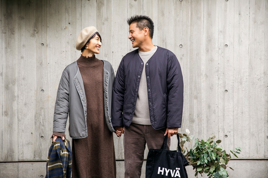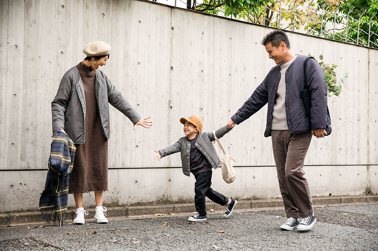 ふたりで過ごす時間は減ってしまったけれど、パパとママになってからの方がふたりの気持ちは近くなったと思う。少し気恥ずかしかったリンクファッションも、息子も入れて3人ですることが増えたし、それがとても自然に思える。シンプルでベーシックなアイテムならなおさら。「さり気なく一緒」をこれからも続けていきたい。