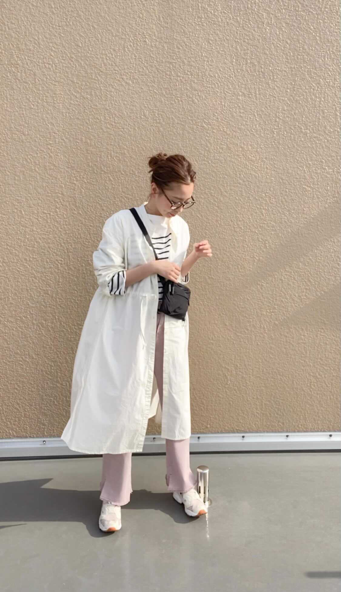 落ち着いたピンクと白のワントーンで女性らしく見えるようにコーディネートしました。シャウターはハリ感のあるお素材なのでインナーにタンクトップなどお首周りがスッキリみえるものと合わせると華奢見えしますよ♡