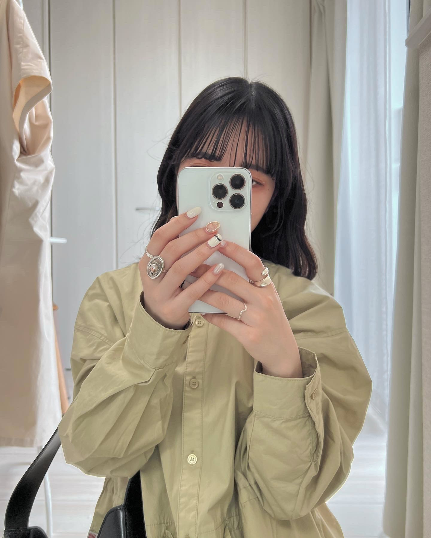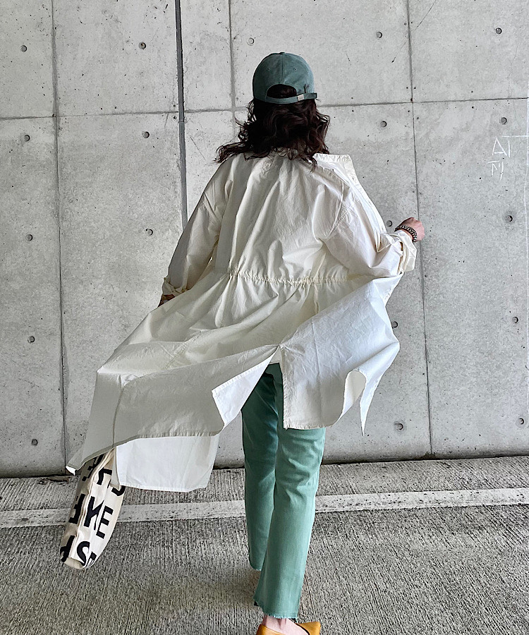 シャツ以上、コート未満のしっかりとしたハリのある生地でシルエットがとても綺麗!ドロストさせてシルエットの変化を楽しめるのも◎170cmで膝下くらいの着丈、ボトムがいちばん綺麗に見える着丈で、アクティブになるこれからの季節、長すぎないのも丁度いい!適度なゆとりとサイドスリットでインナーを選ばない所も使い勝手が良いです。サラッと、すこしシャリ感もある生地が心地よく、汗ばんでも快適で、UV・冷房対策にも良さそうです。