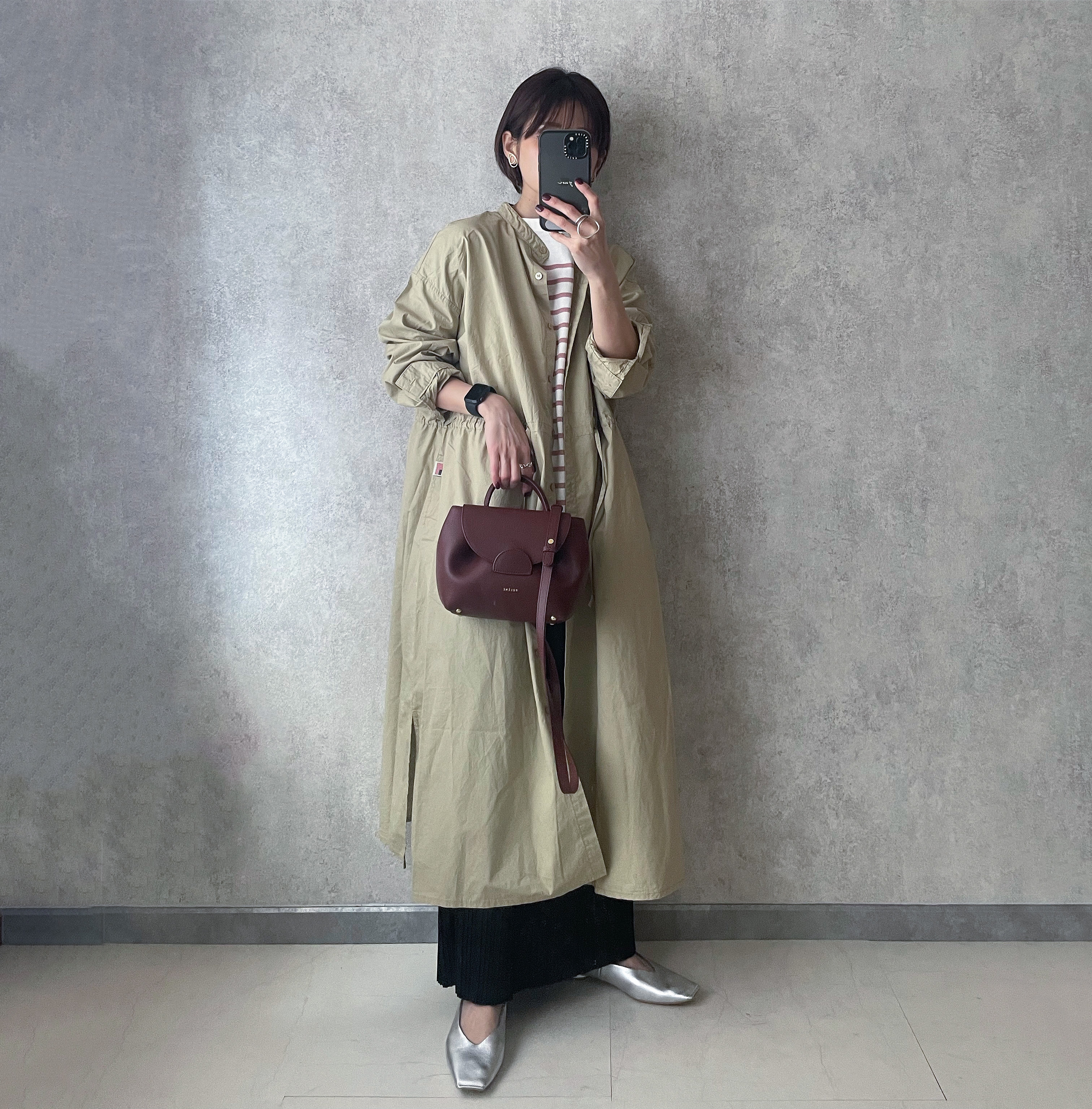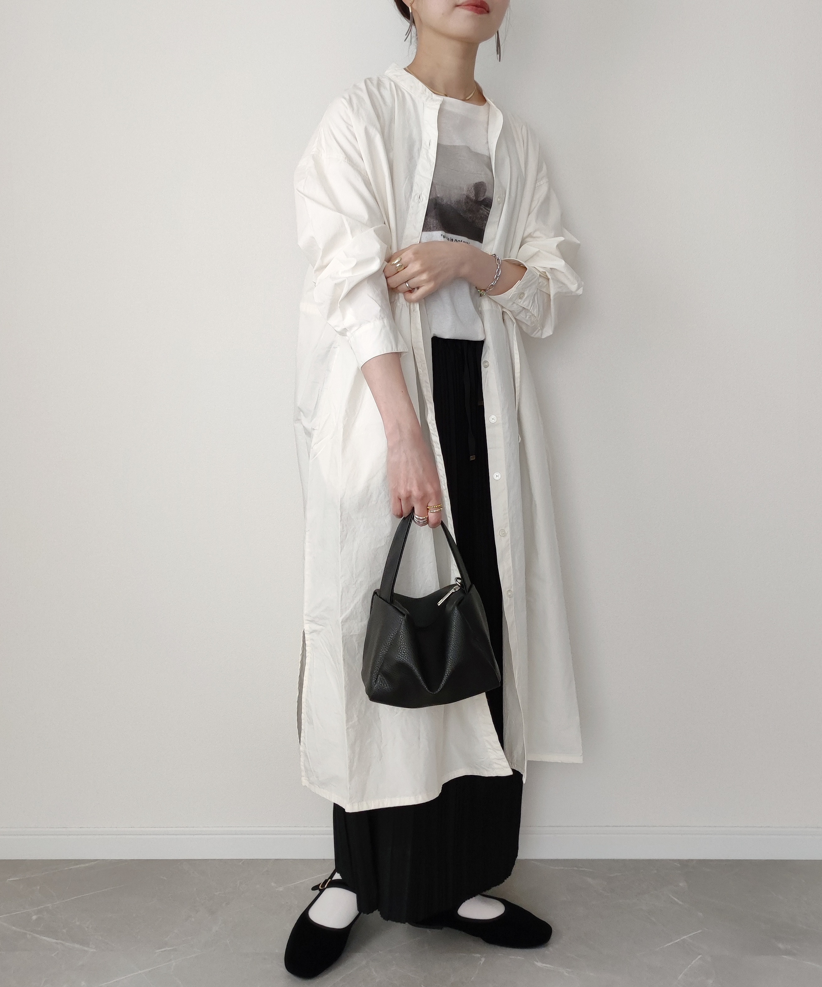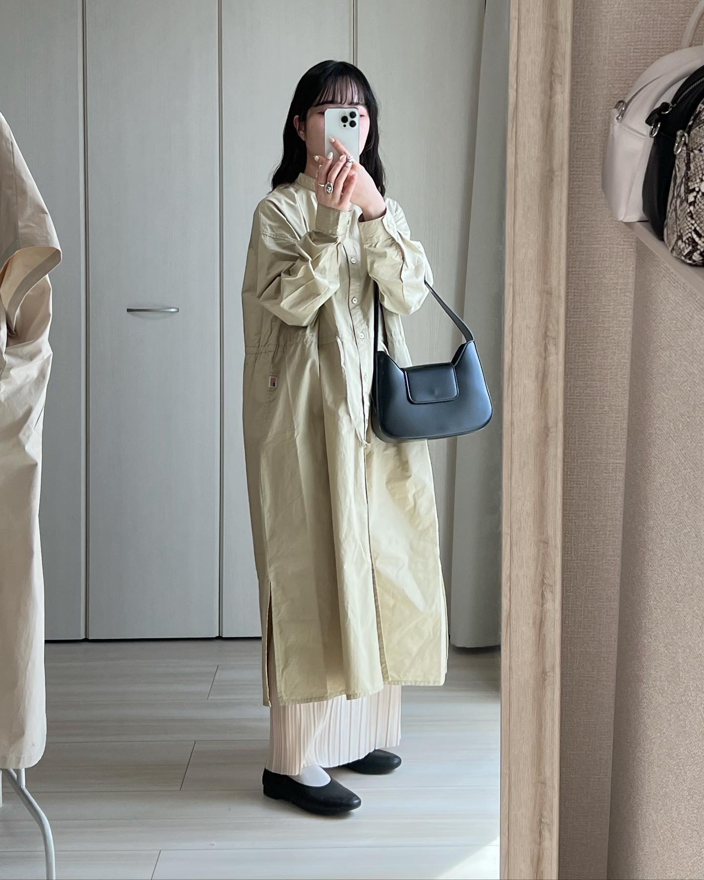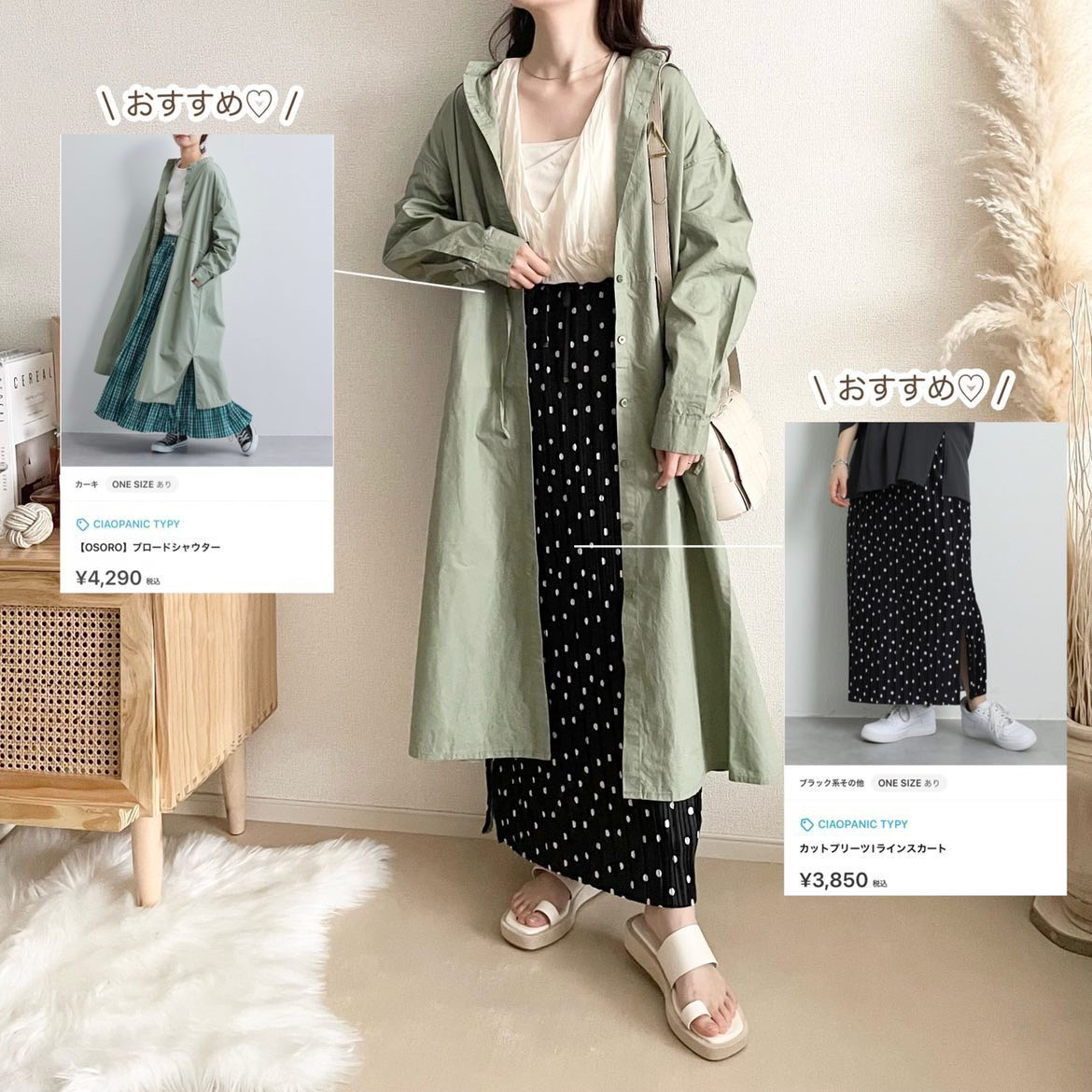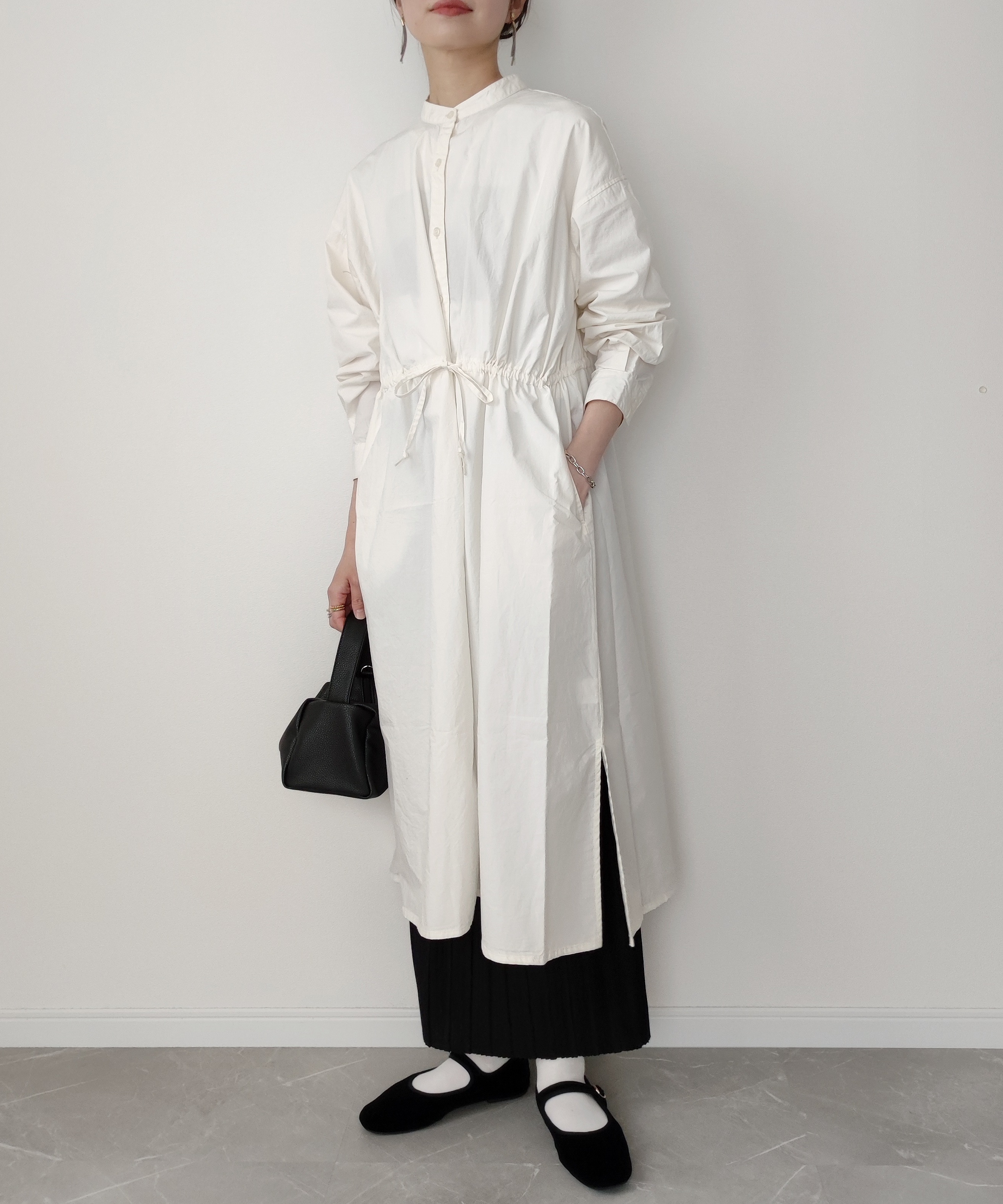 ブロードシャクターはベージュを選びました🌷 きれいめ過ぎず、カジュアルすぎないところがお気に入り! ゆったりとしたシルエットですが、ウエストの紐やスリットがあるので太って見えないところもポイントです。 色味もコーデにとっても合わせやすいです🚶♂️ 今回は前閉じて着てみたけど、前を開けてアウターみたいに着ても可愛いです! ボトムスには同じくCIAOPANICTYPYのカットプリーツIラインスカートのアイボリーを合わせました。