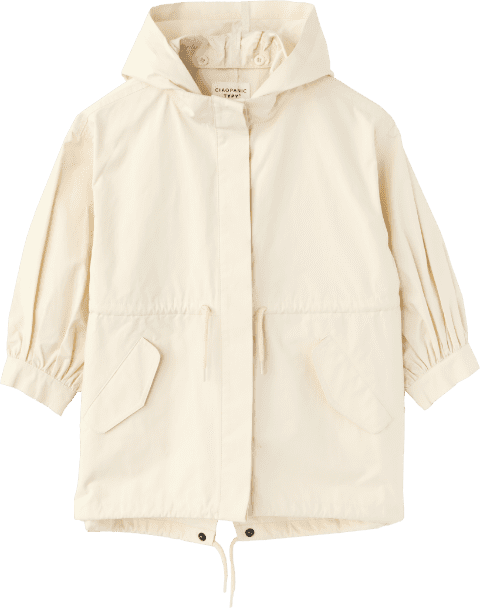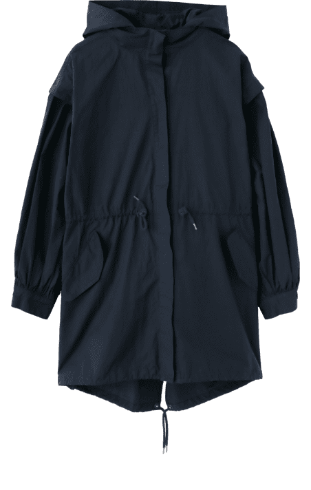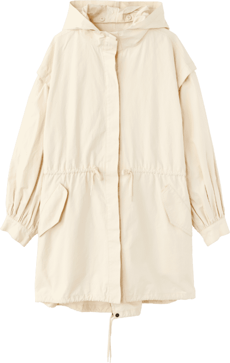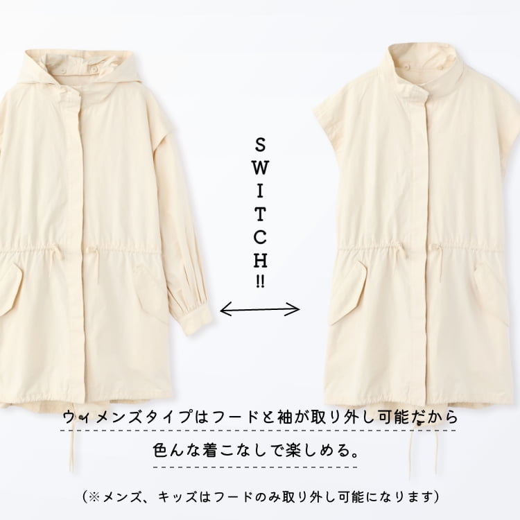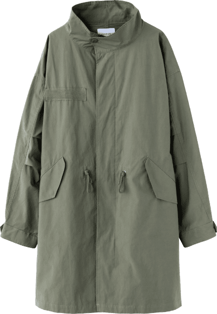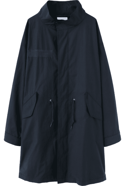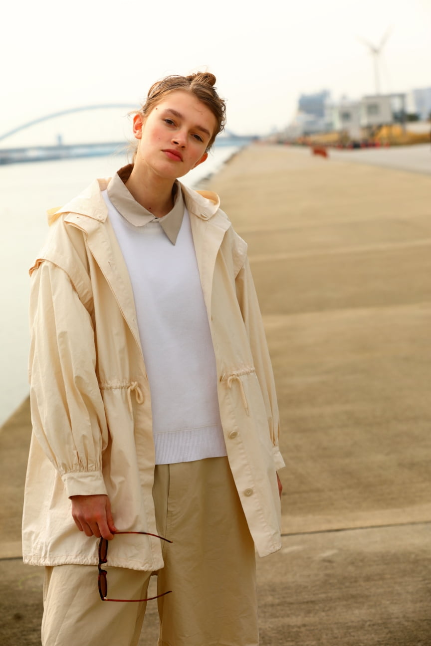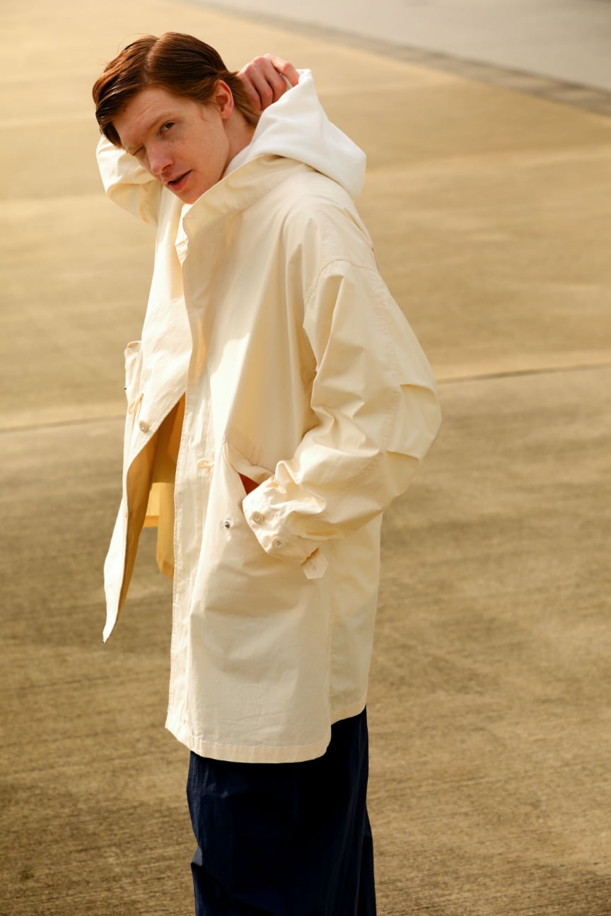 フードを外せば、洗練されたスタンドカラーのアウターに。ラフにざっくり着こなせる大きめのシルエットも魅力。コットン混なので、着込むほどに風合いが増す1着。