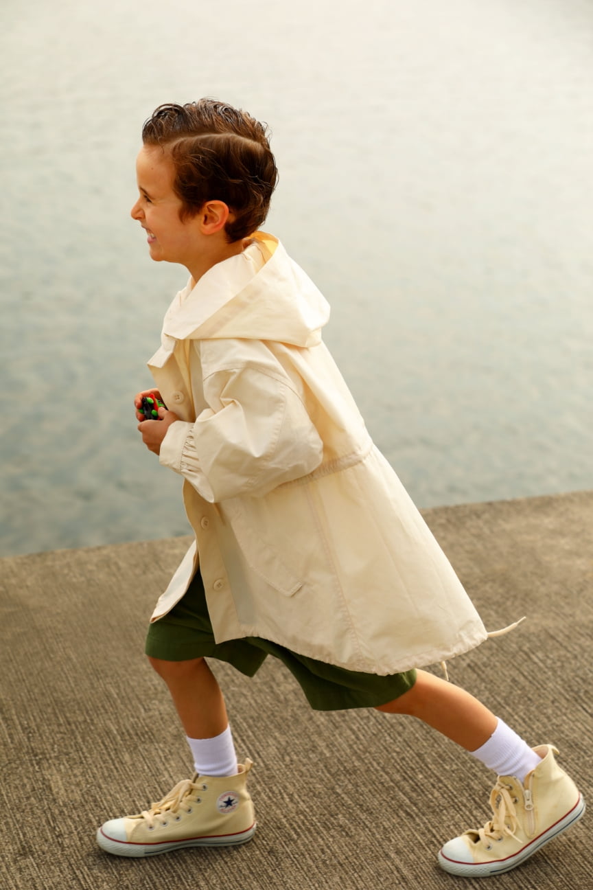 子供でもお洒落に楽しめるアウター。ちょっと大きめのサイズ感でも可愛く着こなせるざっくりシルエットもポイント。ショーツを合わせて軽やかに春を楽しんで!