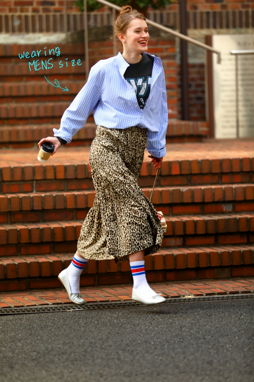 カジュアルなロックTをインしてラフに着くずしたいなら、メンズサイズをチョイスしてみて。シャツをタックインして柄スカートを合わせれば、いつもとは違った表情に。