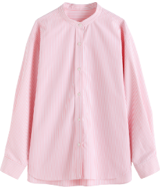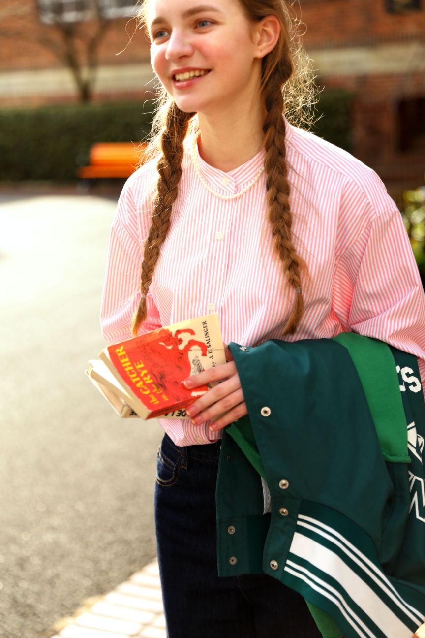 ピンクのストライプシャツには、あえて太めのデニムパンツにトラックジャケットなどボーイッシュなアイテムを合わせて。パステルカラーはプレッピーな着こなしが良く似合う。