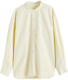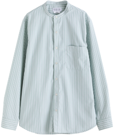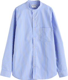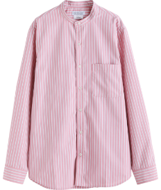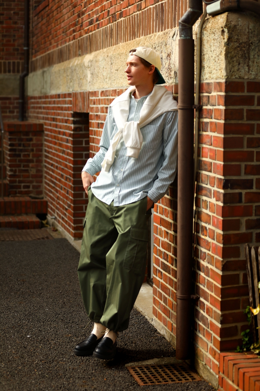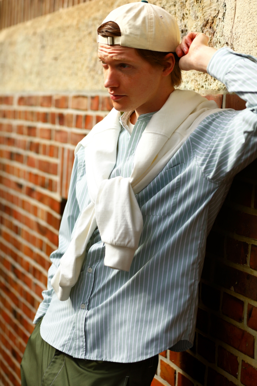 後ろかぶりのキャップや肩掛けスウェットなどでプレッピーな遊び心をプラスして。首元がすっきりと見えるスタンドカラーのシャツなので、レイヤードや肩掛けにも最適な1枚。