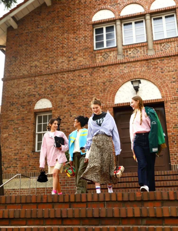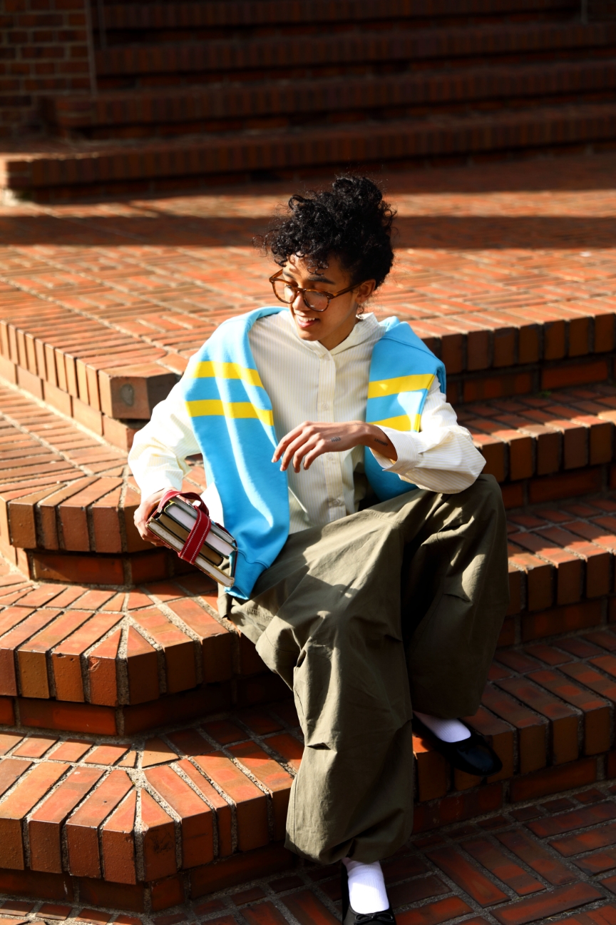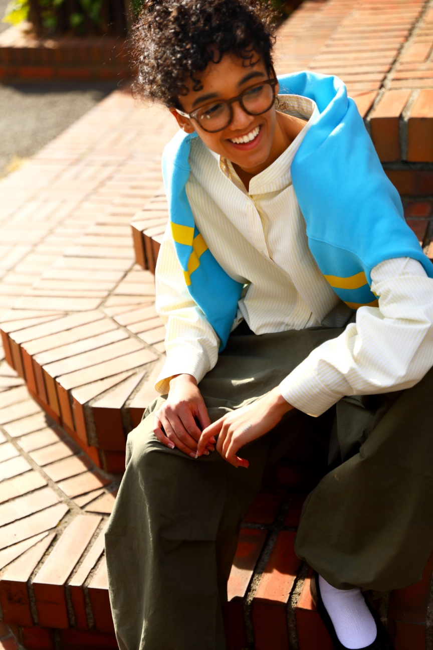 春の日差しに美しく映えるイエローのストライプシャツ。カラフルなスウェットを肩に掛けてアメリカの学生のように、スポーティーで開放的なムードをまといたい。