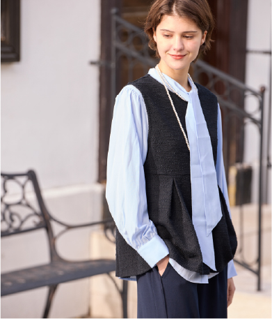 オケージョンシーンだけじゃなく、デイリーユースまで使えるベストとパンツのセットアップを作りました。装飾性の高いボウタイブラウスを合わせたら、ハンサムで華やかなセレモニースタイルの完成です。