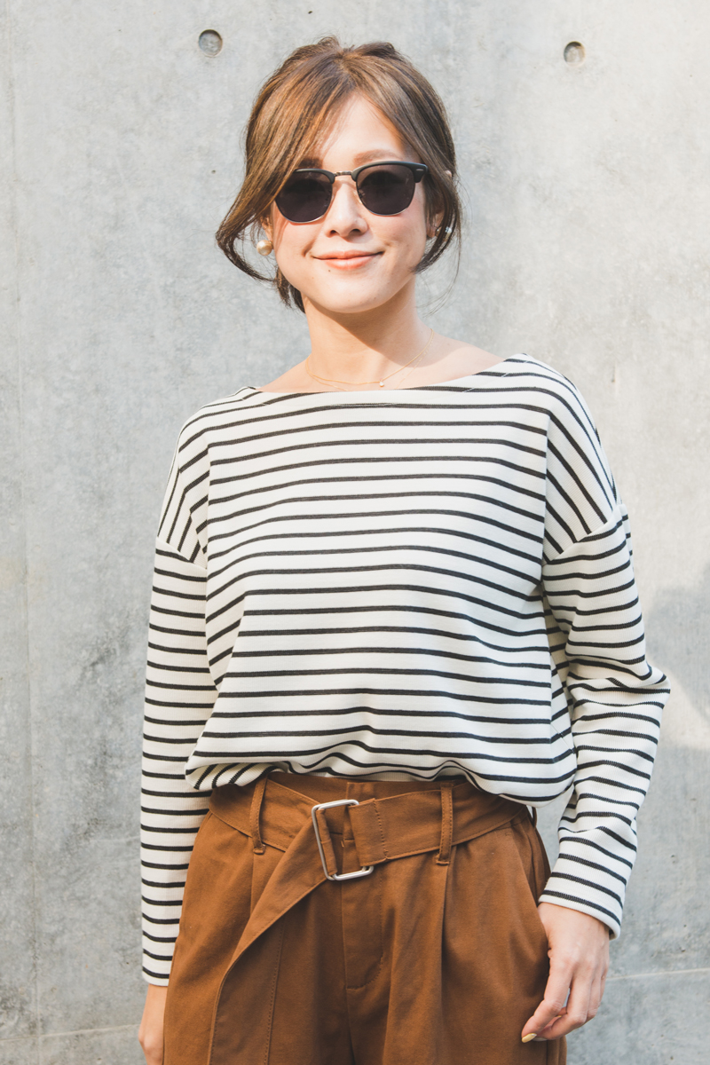『昔から大好きなミリタリー×ボーダーの合わせです。ボーダーTEEはウエストベルトパンツにINすれば脚長効果抜群。サングラス、ボーダー、パンプスをBLKで統一して全体を引き締めました。』