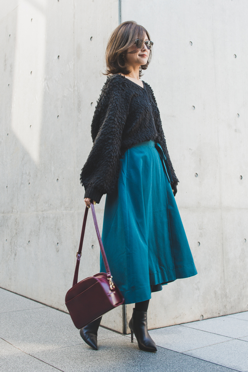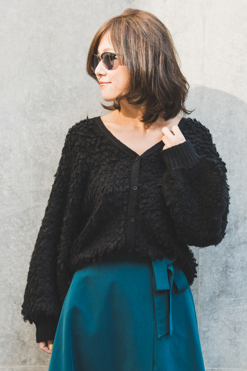 『2人で出掛ける時って、スカートを履きたくなる。そんなオンナ心をかなえてくれる、キレイカラーのふんわりスカートを引き立たせるために、他はブラックでまとめました。ループニットカーデは黒だけど柔らかいデザインだから重くなりすぎないのも◎です。』