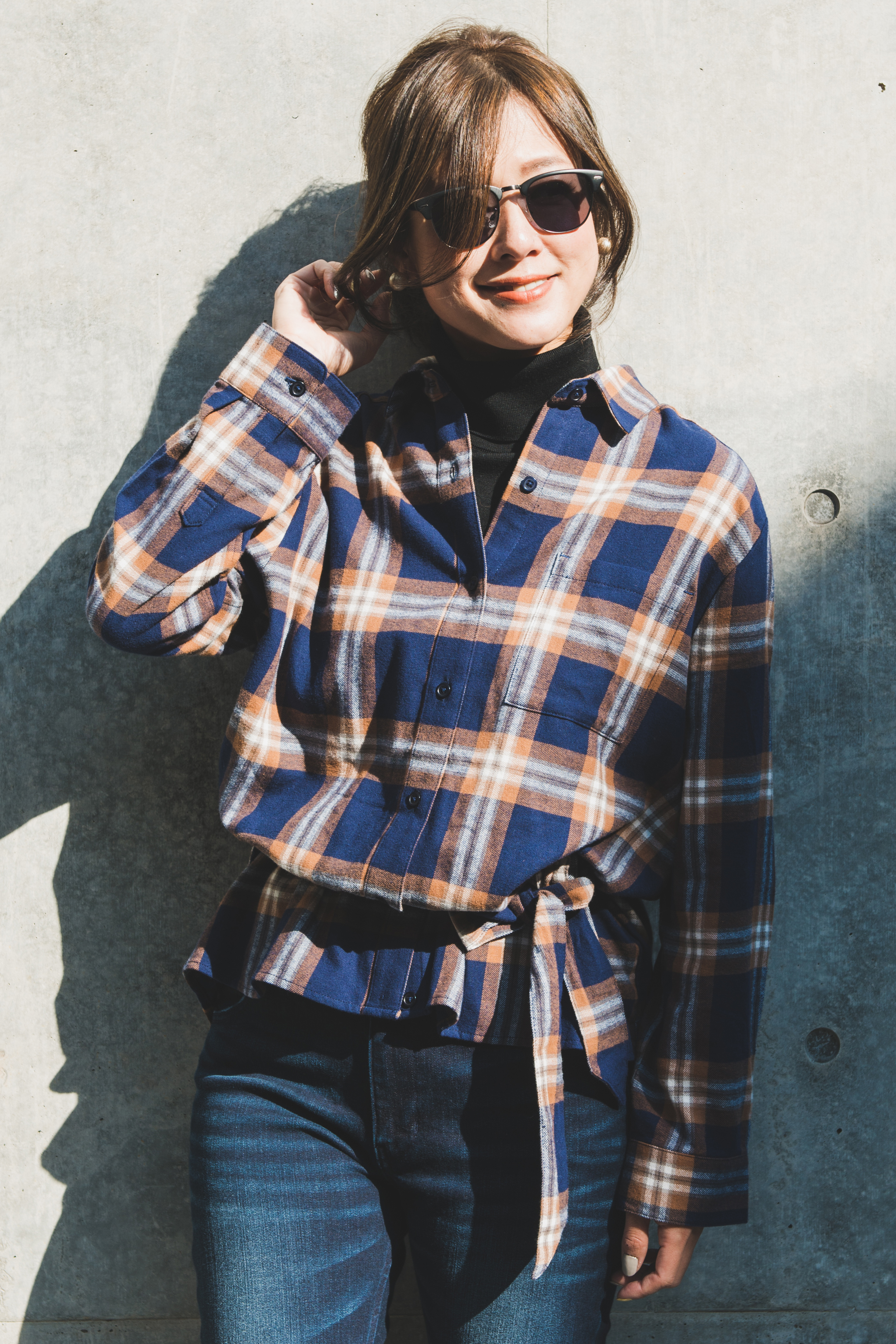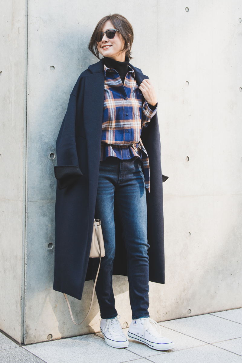 『動きやすさ重視のラクチンコーデはチェックシャツが主役◎カジュアルになりすぎないようハイゲージのタートルネックやウールのコート合わせで大人カジュアルに仕上げました。』
